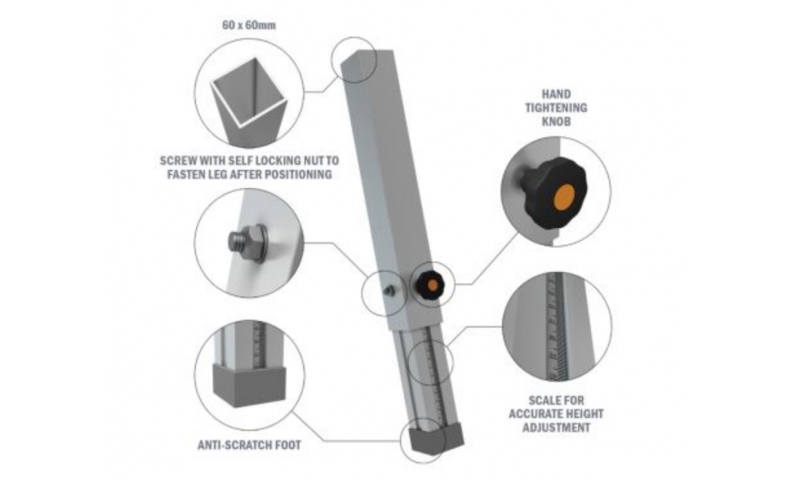 The Global Truss Stage Deck telescopic legs allow the user to erect stage systems either at custom heights or the flexibility to level off a stage when rigged on uneven ground. Each leg features a handwheel for initial height setting plus a locking nut which can be tightened with a spanner ensuring the leg cannot be adjusted after the height has been set. They also have plastic end caps for floor protection and provide maximum stability with the specially designed pressure cube situated in the Global Truss Stage Deck corners accommodating both round and square legs. *Suitable for Stage Deck only. Key Features of Global Truss Stage Deck Telescopic Leg Telescopic Square Leg for Global Truss Stage Deck Platforms