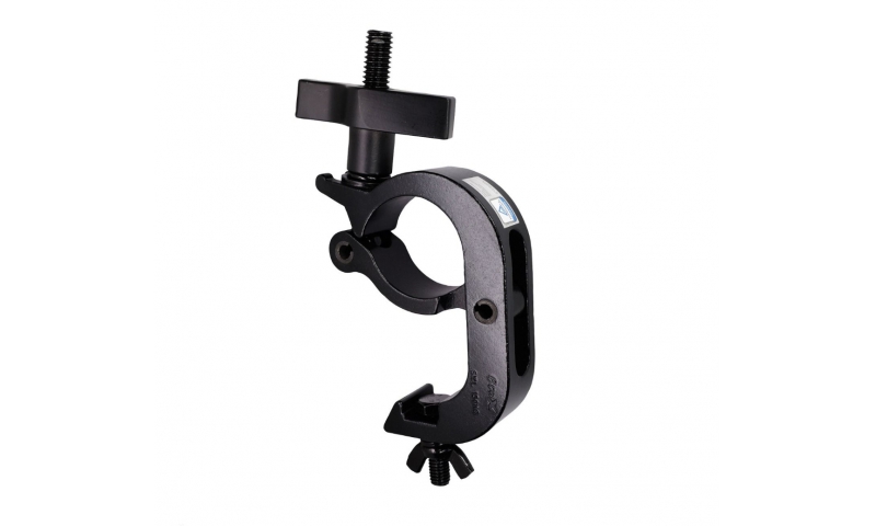 Topfinger-C5H-BLK is an Aluminum Pro Slim Hook Style Clamp with Big Wing Knob for 2" Truss Tube Capacity 330 Lbs. in Black Finish. This Hook/Trigger Clamp is a versatile and reliable solution for mounting professional lighting fixtures to truss chords or other 2" OD pipes or tubes. Its 360º wrap-around design ensures a secure fit and eliminates the need for additional hardware or tools. One of the key features of this clamp is its hook design, which allows it to support the weight of your equipment during the mounting process. This makes it easier and safer to use, as you won‘t have to worry about the fixture falling while you‘re trying to secure the clamp.