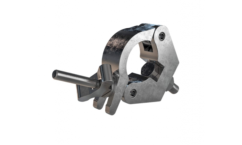 Natural aluminum, clear anodized narrow half-coupler truss clamp.